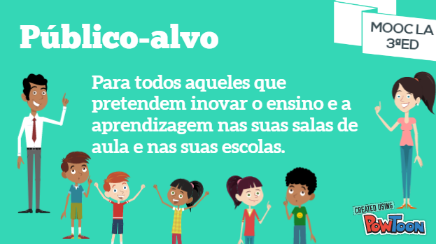 Este MOOC pretende dar a conhecer um conjunto de ferramentas e metodologias, entre outros recursos disponibilizados pelo projeto Future Classroom Lab (FCL) da European Schoolnet (EUN), que permite apoiar os professores e as escolas na criação, adaptação e implementação de cenários inovadores de ensino e de aprendizagem.