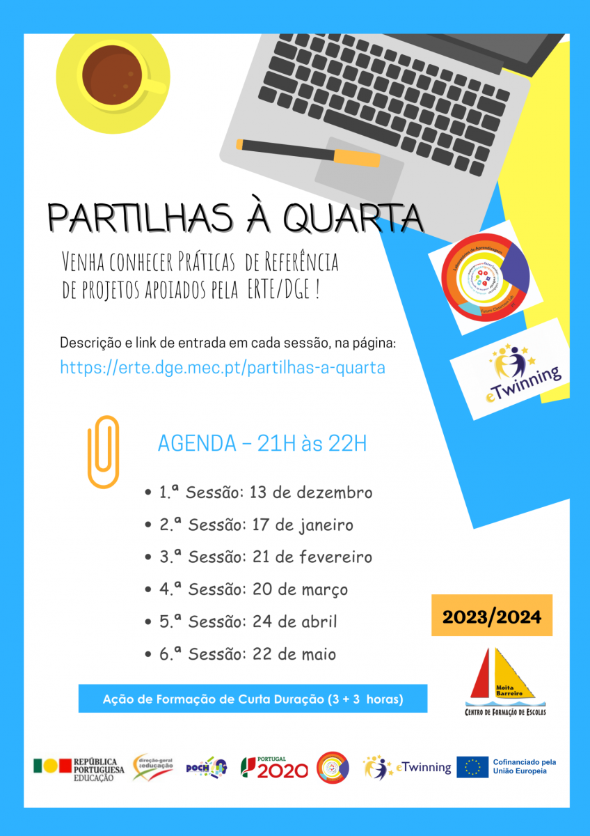 “Partilhas à Quarta”, uma iniciativa desenvolvida no âmbito de projetos apoiados pela Direção-Geral da Educação (DGE), através da Equipa de Recursos e Tecnologias Educativas (ERTE), realiza-se pelo sexto ano consecutivo, com o objetivo de divulgar práticas de referência de ensino e de aprendizagem. Estas videoconferências são promovidas, em colaboração, pelas equipas Laboratórios de Aprendizagem (LA) e eTwinning (eTw), contando, ainda, com a participação de professores e alunos envolvidos nos projetos apoiados pela DGE/ERTE.