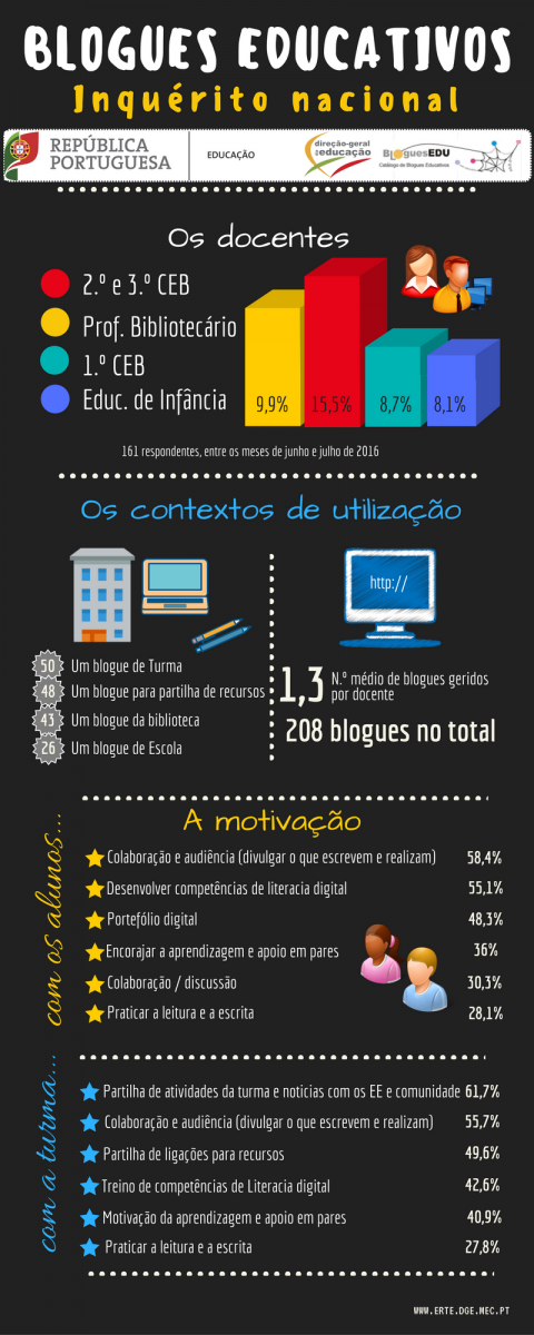 Entre os meses de junho e julho de 2016, cerca de 161 docentes de todos os ciclos de ensino, responderam a um questionário concebido pela Equipa de Recursos e Tecnologias Educativas da Direção-Geral da Educação acerca da utilização de blogues como recurso e estratégia educativa. Este questionário foi enviado a todos os utilizadores registados do catálogo BloguesEDU (Portal das Escolas).